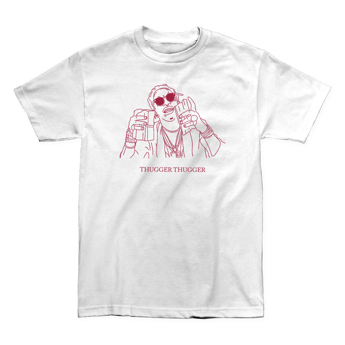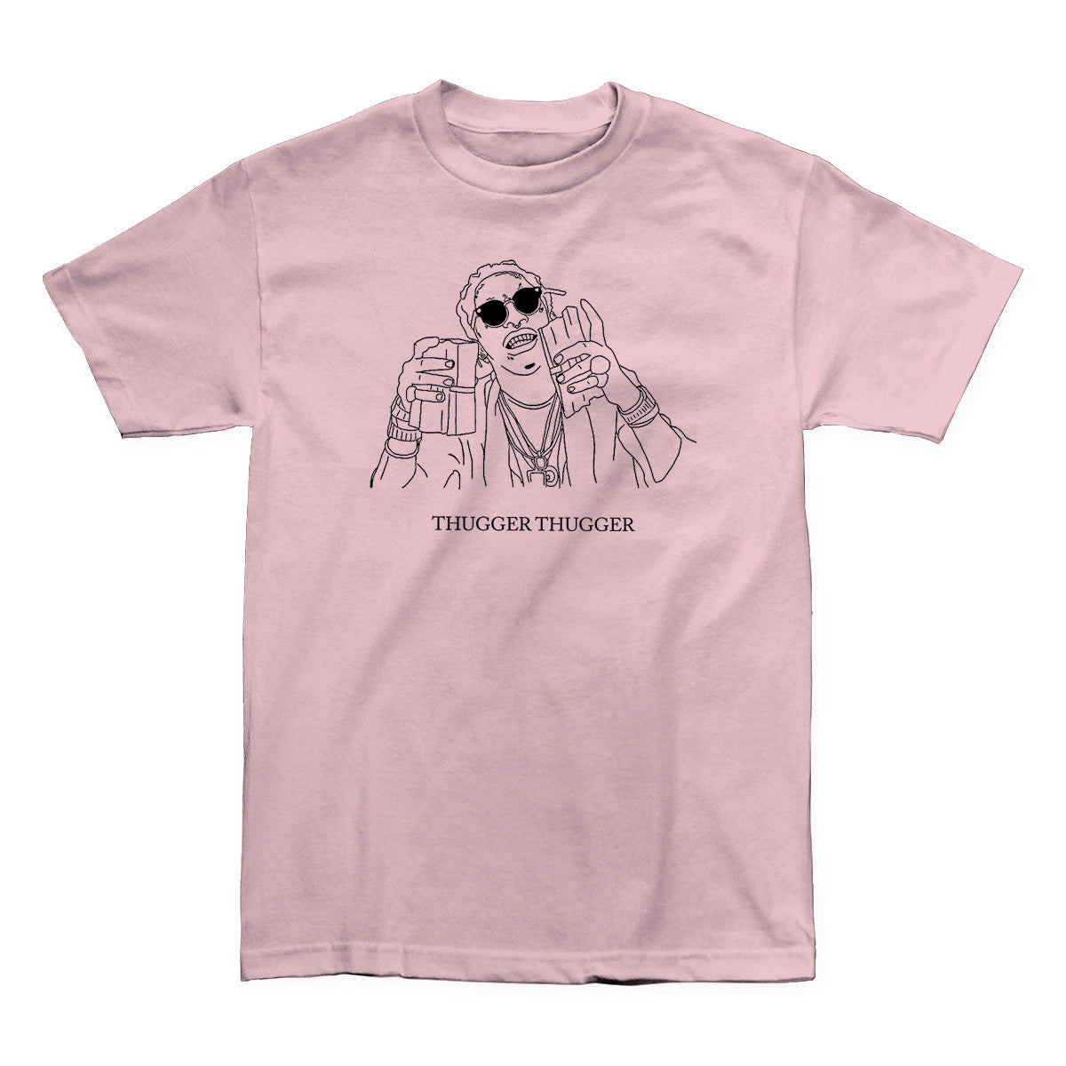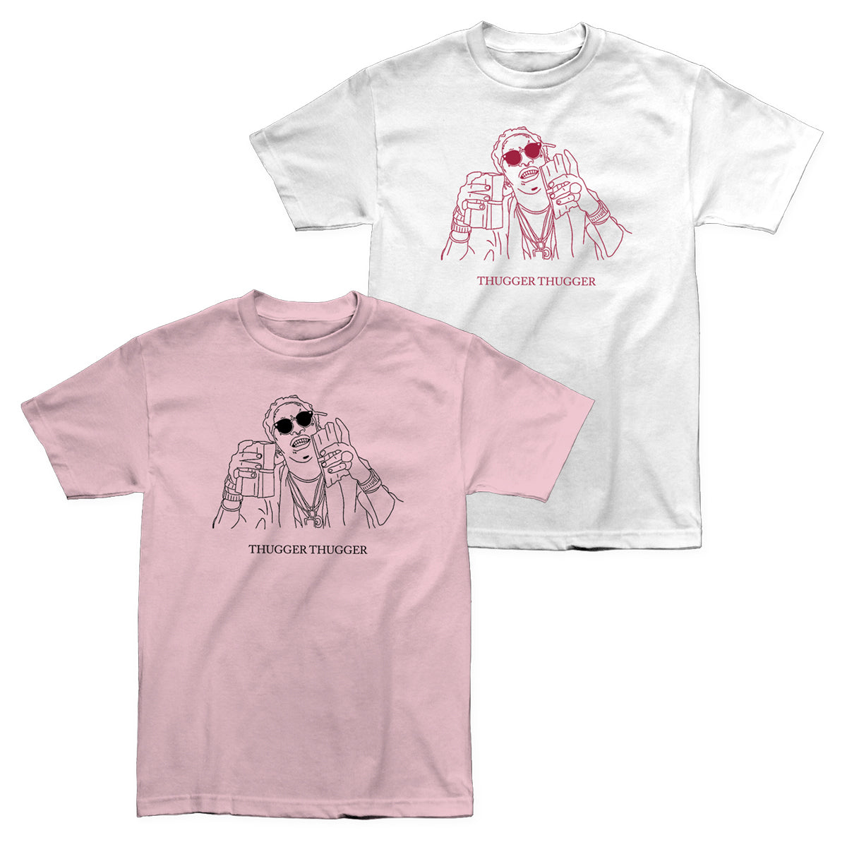 Printed on pink or white American Apparel 1301, formerly Alstyle.